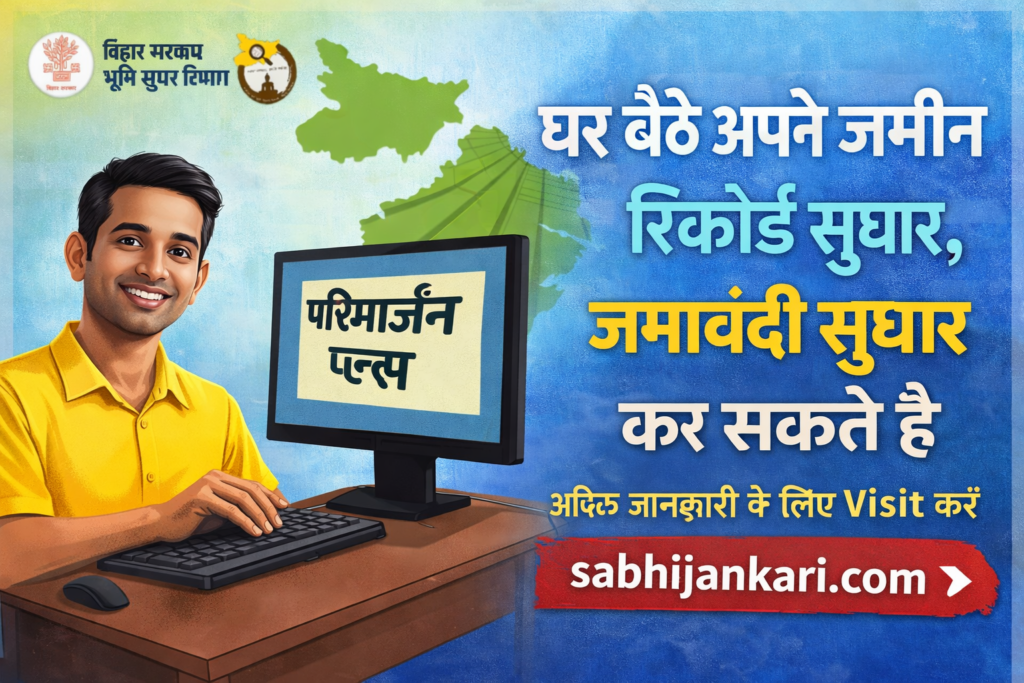 Parimarjan Plus Bihar Portal 2026 से नाम, खाता, खेसरा, रकबा, लगान और जमाबंदी सुधार कैसे करें? पूरी प्रक्रिया, पात्रता, दस्तावेज और स्टेप-बाय-स्टेप गाइड हिंदी में।